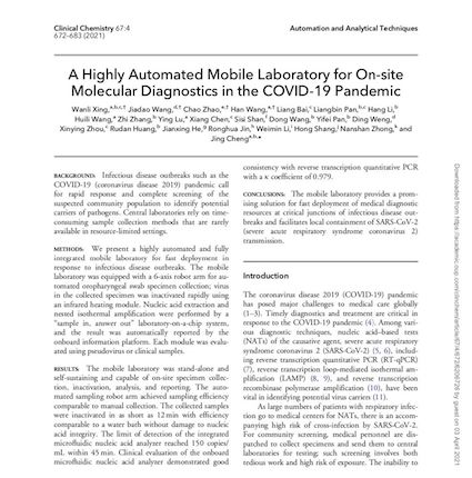這一抗疫利器的研發(fā)成果以題為"A Highly Automated Mobile Laboratory for On-site Molecular Diagnostics in the COVID-19 Pandemic"的研究論文于2020年4月在國際檢驗醫(yī)學界權(quán)威雜志《臨床化學》(Clinical Chemistry)重磅發(fā)表,該論文詳細闡述了“輕騎兵”的性能特點和檢測能力等成果,得到了國內(nèi)外廣泛關(guān)注。該項重量級抗疫攻關(guān)科研成果的發(fā)表,為新冠病毒核酸檢測移動實驗室快速部署醫(yī)療診斷系統(tǒng)提供了一種有發(fā)展前景的解決方案,有助于控制新冠病毒的區(qū)域性傳播。