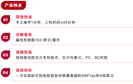 基于全新一代先進(jìn)的芯片實驗室(Lab-on-a-chip)設(shè)計理念,化繁為簡,檢測時僅需將樣本保存液加入芯片,封閉芯片后即可上機,手工操作小于1分鐘。生物反應(yīng)全程(包括核酸提取、核酸純化、擴增反應(yīng)、核酸檢測和結(jié)果判讀等)均集成在一個整體密閉、內(nèi)部分區(qū)的微流控芯片內(nèi),由全自動核酸分析儀完成,因此無需專業(yè)分區(qū)實驗室,無需人工干預(yù),最大程度降低操作人員感染及樣本間交叉污染的風(fēng)險。45分鐘完成實驗全過程,最快可在35分鐘內(nèi)檢出新冠陽性樣本,檢測靈敏度可達(dá)150拷貝/毫升,在截至目前國內(nèi)獲批的同類產(chǎn)品中靈敏度最高,真正實現(xiàn)“樣本進(jìn)-結(jié)果出”。
