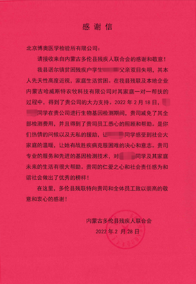 我縣諾爾鎮(zhèn)貧困殘疾戶學(xué)生xxx父親雙目失明,其本人先天性高度近視,家庭生活貧困。在我縣殘聯(lián)及本地企業(yè)內(nèi)蒙古哈維斯特農(nóng)牧科技有限公司對(duì)其家庭一對(duì)一幫扶的過程中,得到了貴公司的大力支持。2022年2月18日,xxx同學(xué)在貴公司進(jìn)行生物基因檢測(cè)期間,貴司減免了其全部檢測(cè)費(fèi)用,并且得到了貴司員工悉心的照顧和幫助。是你們熱情的問候以及無私的援助,讓xxx同學(xué)感受到社會(huì)大家庭的溫暖,讓她有戰(zhàn)勝疾病克服困難的決心和意志。貴司專業(yè)的服務(wù)和先進(jìn)的基因檢測(cè)技術(shù),對(duì)xxx同學(xué)及其家庭未來的生活有很大幫助。貴司的仁愛之心和社會(huì)責(zé)任感為和諧社會(huì)做出了優(yōu)秀的榜樣!
