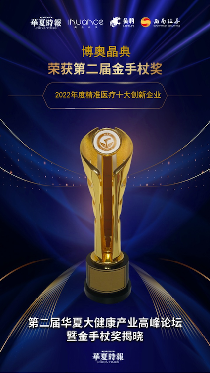 歲末年初,博奧晶典憑借在精準(zhǔn)醫(yī)療領(lǐng)域的多項(xiàng)核心專利技術(shù)和高質(zhì)量創(chuàng)新產(chǎn)品,在近日由華夏時(shí)報(bào)社、蘭州新區(qū)管委會(huì)等單位共同主辦的第二屆華夏大健康產(chǎn)業(yè)高峰論壇暨金手杖獎(jiǎng)?lì)C獎(jiǎng)盛典上喜獲“2022年度精準(zhǔn)醫(yī)療十大創(chuàng)新企業(yè)”。此次獲得2022年度精準(zhǔn)醫(yī)療十大創(chuàng)新企業(yè),是對(duì)博奧晶典科技創(chuàng)新能力的充分肯定,亦是對(duì)博奧晶典行業(yè)龍頭地位的高度認(rèn)可。
