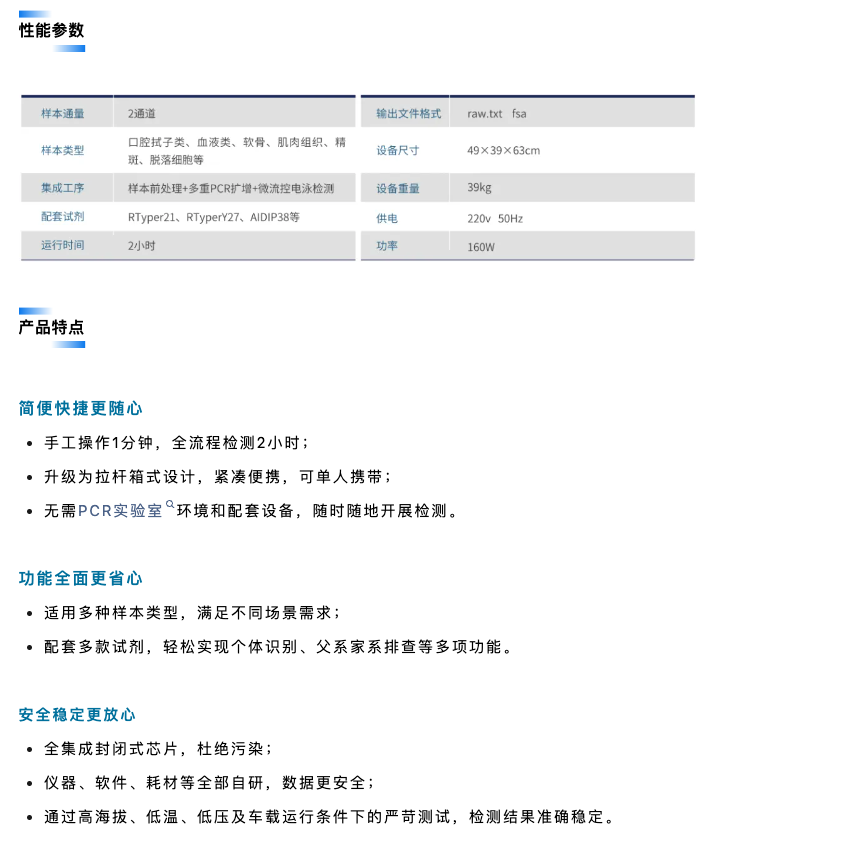 該設(shè)備采用拉桿箱式設(shè)計(jì),可由單人攜帶使用,適用于戶外、車(chē)載、高原環(huán)境等,是國(guó)際首款“可移動(dòng)法醫(yī)DNA實(shí)驗(yàn)室”,為全球公共安全部門(mén)在現(xiàn)場(chǎng)物證檢驗(yàn),重點(diǎn)人員篩查、重大公共安全事件的快速處置、出入境邊防檢查等應(yīng)用場(chǎng)景增添強(qiáng)勁利器。
