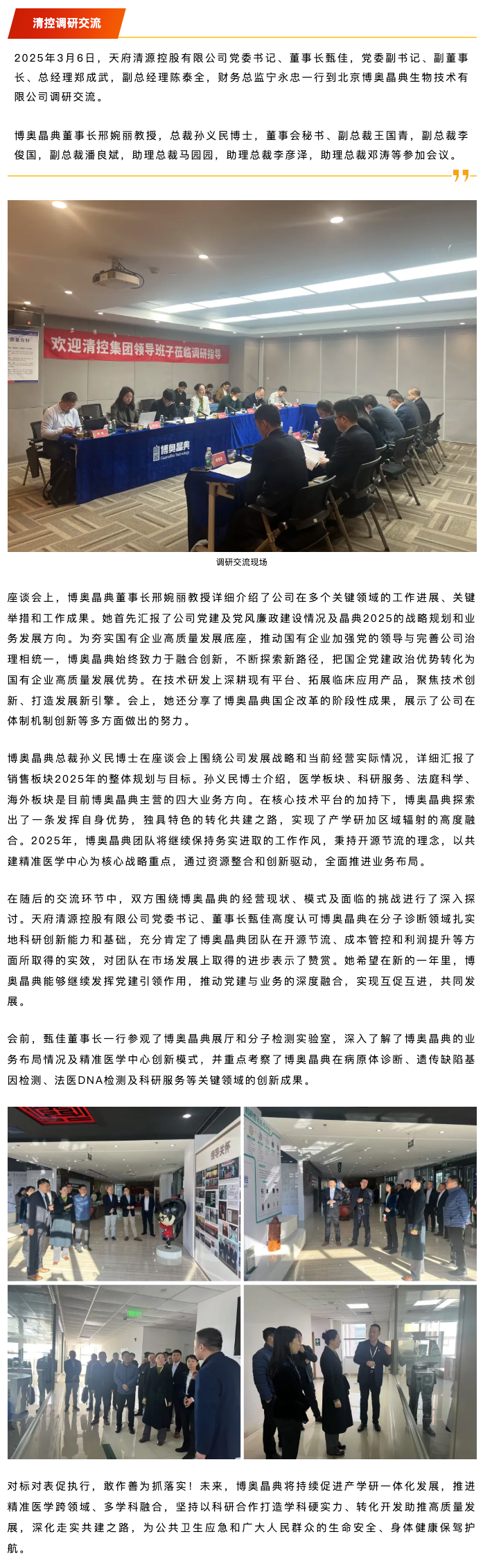 天府清源控股有限公司黨委書記、董事長甄佳一行到博奧晶典調(diào)研交流