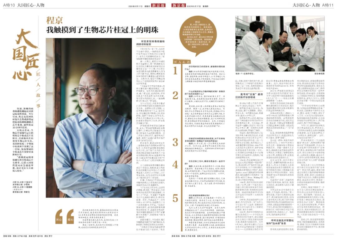 各方凝聚起的“工匠”精神賦予我們跨越山海的底氣。9月17日,新京報(bào)推出2020“大國(guó)匠心”致敬特刊,其中《匠心·聚力-2020年大國(guó)匠心年度人物》特刊A10-11兩整版報(bào)道了2020年度大國(guó)匠心年度人物-中國(guó)工程院院士、清華大學(xué)醫(yī)學(xué)院講席教授、博奧生物集團(tuán)有限公司總裁程京帶領(lǐng)團(tuán)隊(duì)在新冠肺炎疫情期間攻堅(jiān)克難、研發(fā)多項(xiàng)抗疫核心技術(shù),以及程京院士在過去幾十年為之奮斗不止的“芯路歷程”。