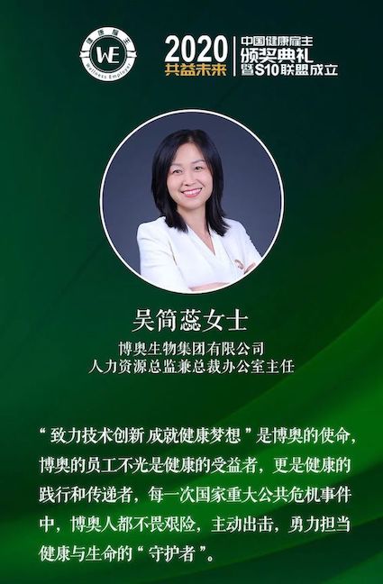 12月18日,由中國人力資源管理研究會攜手聯(lián)合國契約組織國際WELL建筑研究院、太極禪、世界可持續(xù)發(fā)展領(lǐng)導(dǎo)力組織、上海市著名外企工會聯(lián)合會及中智上海技術(shù)經(jīng)濟技術(shù)合作有限公司等機構(gòu)共同舉辦的第四屆(2020年)中國最佳健康雇主評選在上海揭曉。博奧生物集團憑借抗疫期間的卓越貢獻,斬獲“抗疫先鋒獎”并蟬聯(lián)“中國十佳健康雇主”。