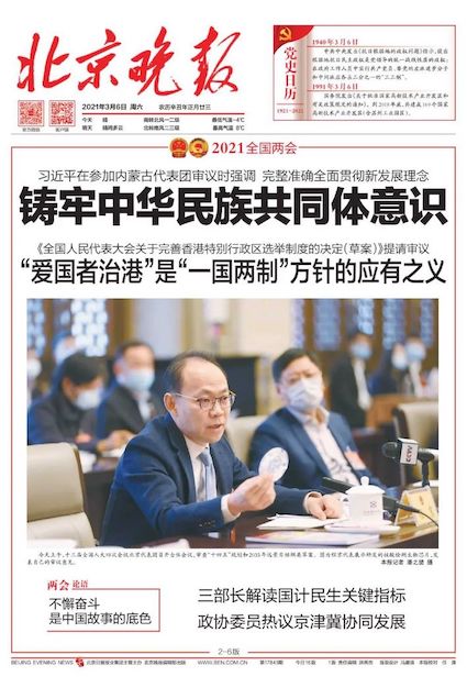 3月6日,十三屆全國(guó)人大四次會(huì)議北京代表團(tuán)召開(kāi)全體會(huì)議,審查“十四五”規(guī)劃和2035年遠(yuǎn)景目標(biāo)綱要草案。圖為程京代表展示團(tuán)隊(duì)研發(fā)的全自動(dòng)、全封閉式可在45分鐘內(nèi)以150拷貝/毫升靈敏度完成“樣本入-結(jié)果出”,35分鐘就能報(bào)陽(yáng)的“全集成新冠病毒核酸檢測(cè)芯片”(于2021年2月9日獲國(guó)家藥監(jiān)局應(yīng)急審批批準(zhǔn)和歐盟CE-IVD認(rèn)證)。