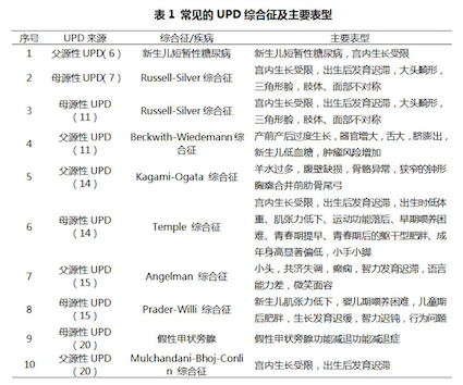 大多數(shù)染色體UPD沒(méi)有臨床表型,當(dāng)UPD發(fā)生在印記基因區(qū)域則會(huì)導(dǎo)致印記基因異常,出現(xiàn)異常的表型。目前針對(duì)上述UPD綜合征(表1)尚無(wú)有效的治療手段,因此,早發(fā)現(xiàn)、早診斷、早干預(yù)對(duì)于此類(lèi)疾病的防控尤為重要。